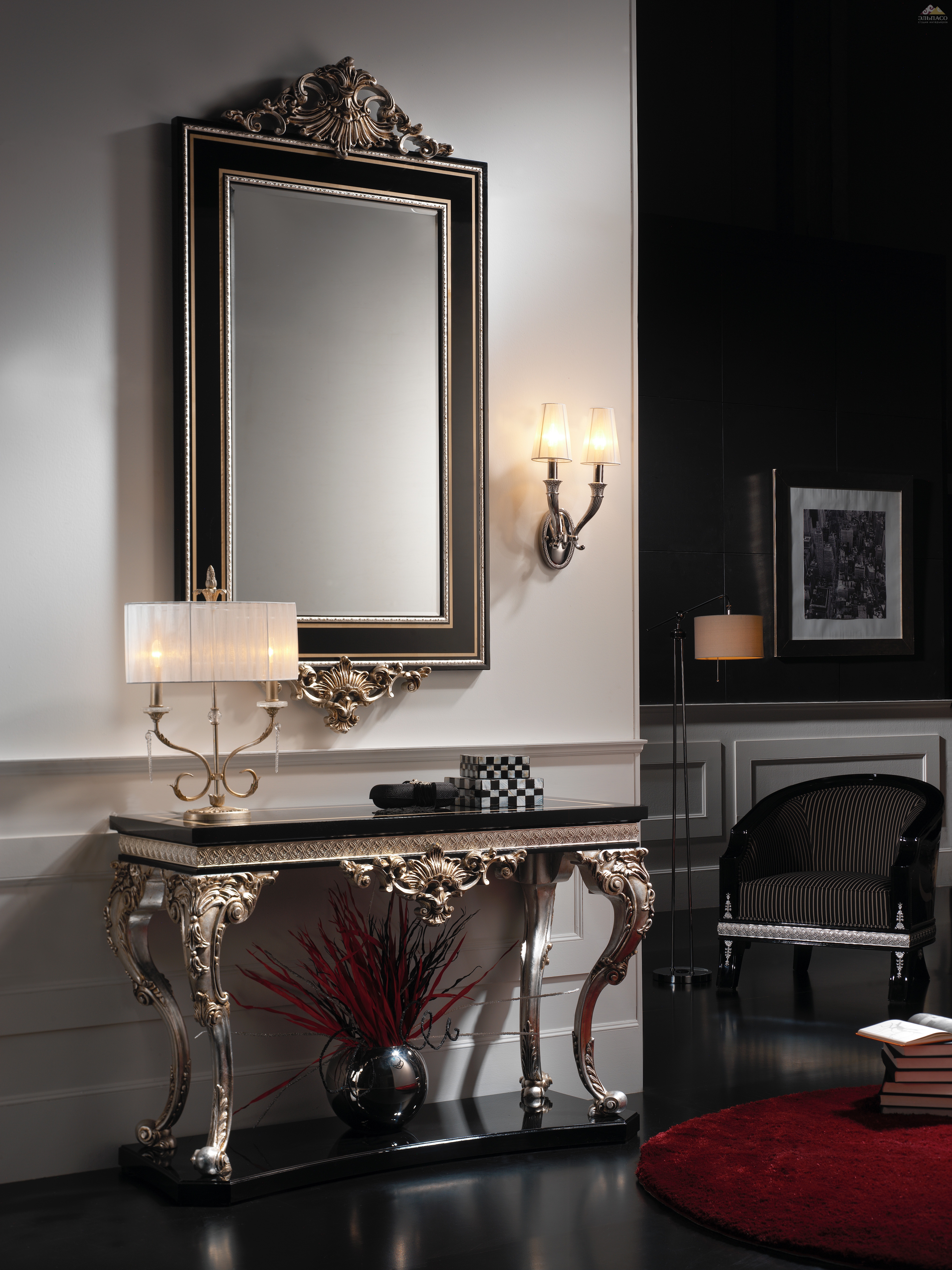 Стильное зеркало Mariner Аrt.2430 прямоугольной формы с резными украшениями рамы. Каркас модели изготовлен из массива дерева, покрытого натуральным шпоном грецкого ореха. Поверхности полированы вручную, отделаны черным лаком. Корпус декорирован бронзовыми литыми узорами, покрытыми серебряной фольгой. Красота, роскошь, практичность.