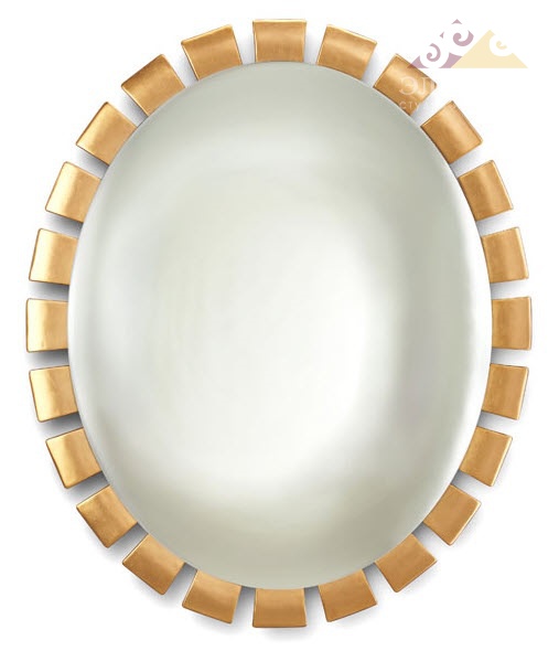 Настенное зеркало овальной формы для разных помещений с обрамлением стилизованным в виде коротких солнечных лучей. Изготовлено из дерева твердых пород.Декор золотым лаком. Применена ручная резьба.