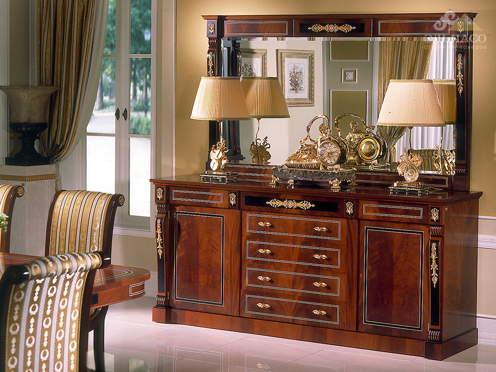 Блестящее зеркало Soher Аrt.3383 прямоугольной формы с карнизом. Каркас модели изготовлен из массива древесины, покрытого натуральным шпоном красного дерева. Поверхности полированные, отделаны прозрачным и черным лаком. Применена ручная обработка материала. Пилястры визуально выделены черным лаком. Рама декорирована резными узорами, покрытыми фольгой из французского золота. Уникальность, красота, величие.