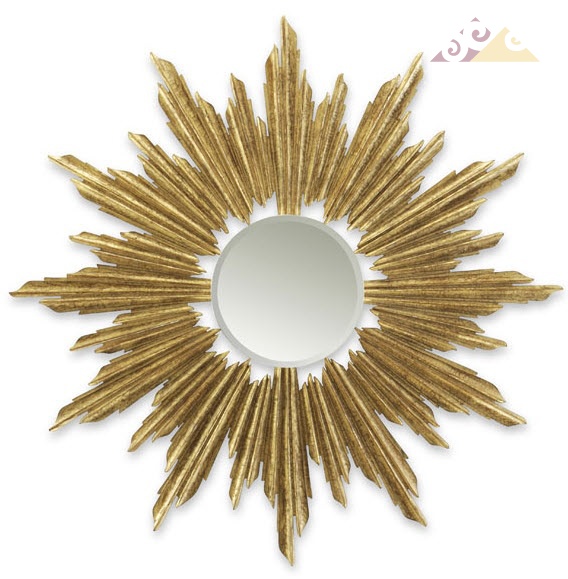 Эффектное настенное зеркало для разных помещений. Изготовлено из махагона. Применена техника ручной обработки материала. Дизайн в виде мерцающего лучистого солнца. Поверхности покрыты золотым лаком.