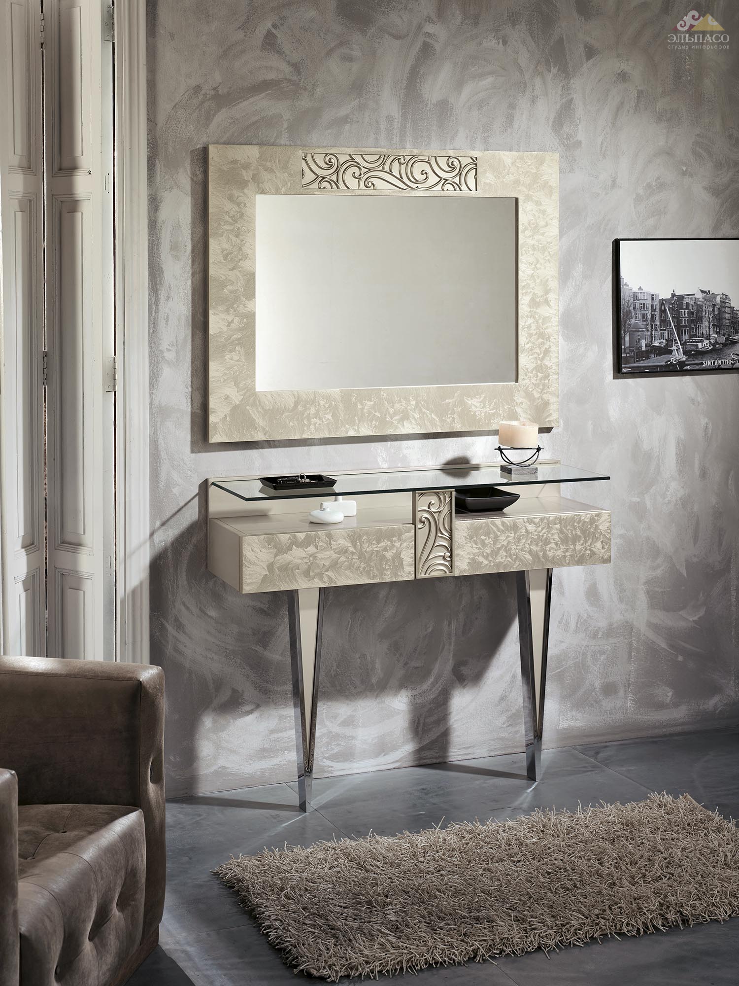 Зеркало прямоугольной формы. Верхняя часть рамы декорирована резным узором. Отделка - кремовый матовый лак или шампань.