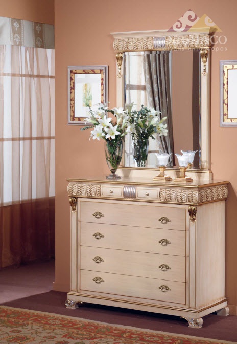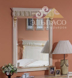 Прямоугольное настенное зеркало в деревянной раме цвета топленого молока. Сделано из высококачественных материалов. Рама зеркала покрыта лаком Arena и декорирована элементами в отделке сусальным золотом.