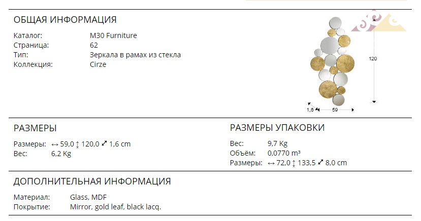Высота:120 смДекоративное зеркало Schuller Cirze Art.472684 в форме круглых зеркальных сфер и стекла с фоном из золотых листьев, на основе из МДФ чёрного цвета.