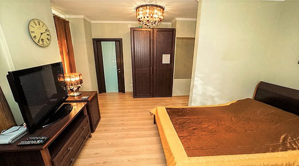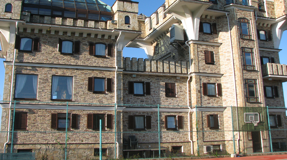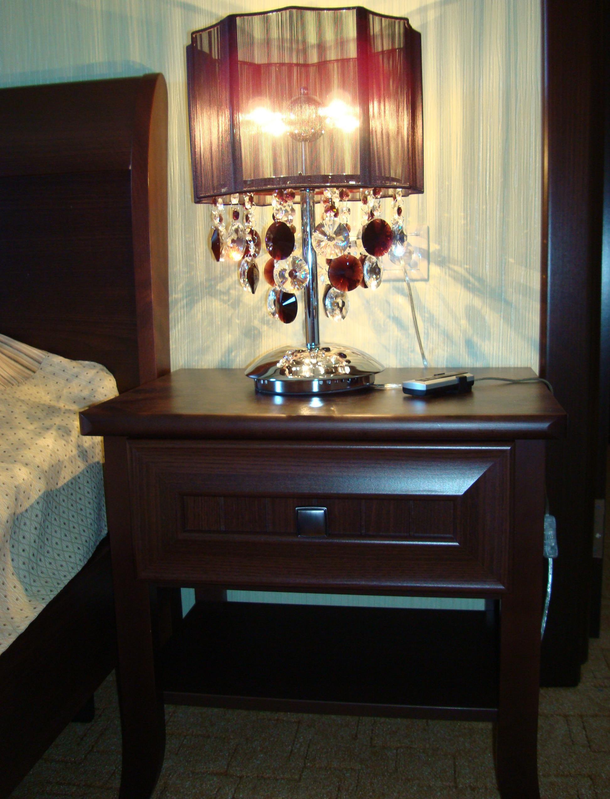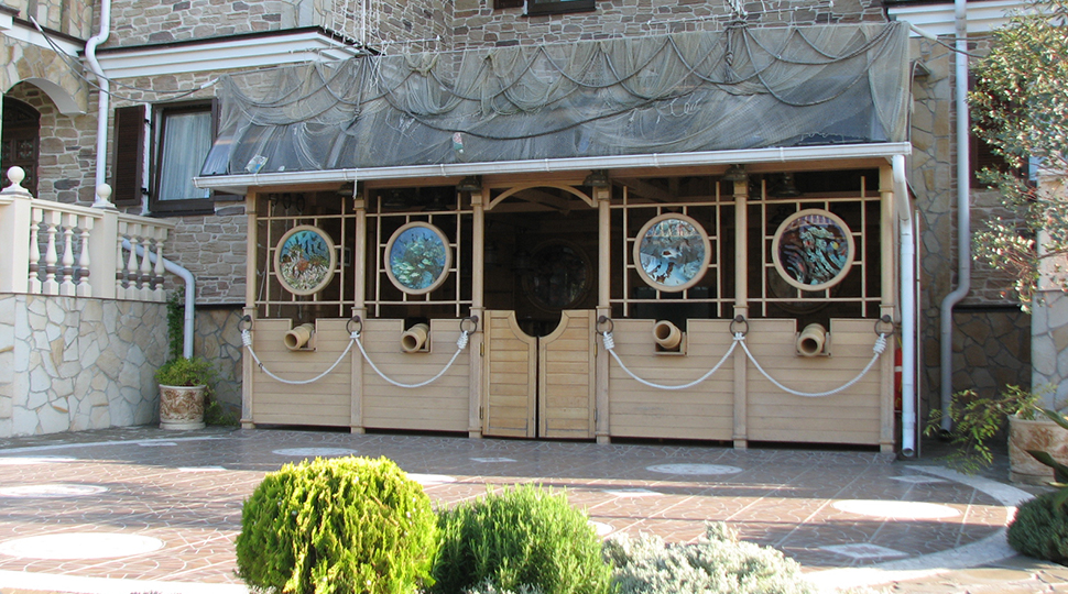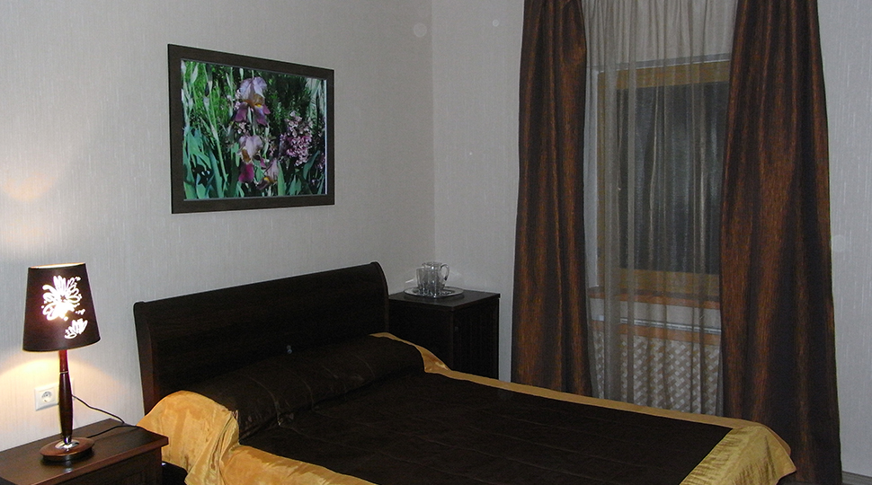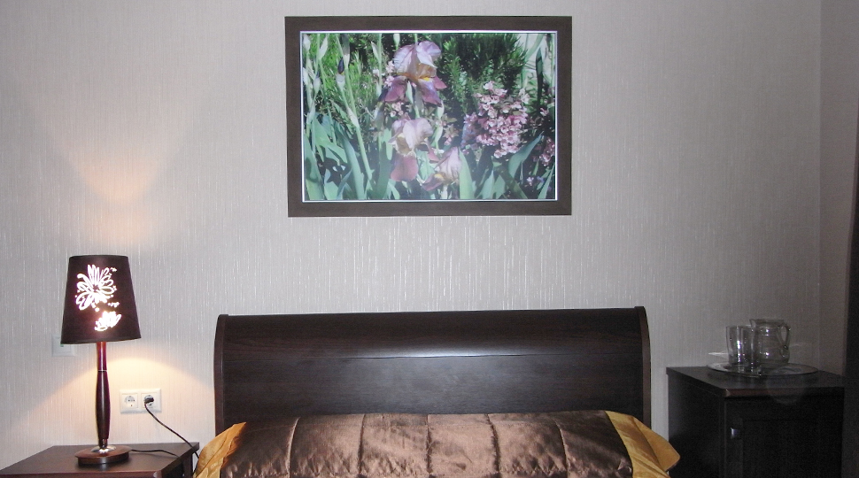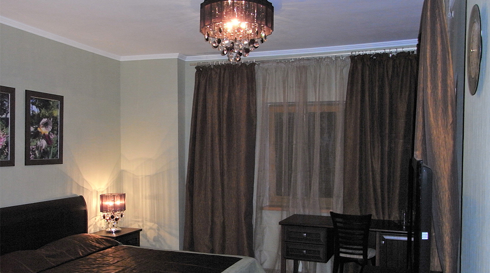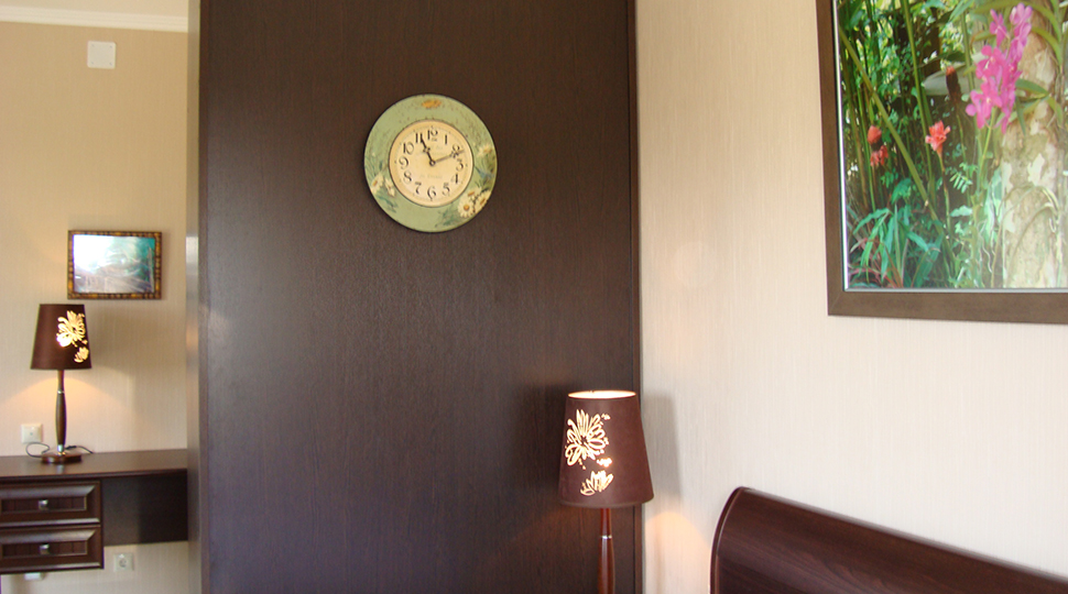 Основной современный оттенок мебели "венге" на контрасте оживляли яркими акцентами: красивыми абажурами люстр с фиолетовыми стеклянными подвесами и фиолетовыми нитями, уютными торшерами с прорезями в форме растительных узоров. В номерах создали настроение фото постеры с видами замка и экзотическими животными и цветами. По колористике номера разделены на два типа: лаймовый и абрикосовый. Бар гостиницы "Замок стилизован под подводную трюм подводной лодки, в иллюминаторах которого видны глубины и обитатели океана. Кругосветное путешествие на собственной подводной лодке- мечта хозяина "Замка". Исходя из этих двух основных цветов моделировались покрывала на кровати: центральные части ошивались в оттенках лайм и золотистый абрикос, а фестоны по периметру покрывал— в более темный цвет под мебель. Каждый номер был декорирован своей тематикой фото-постеров с цветными паспорту в тон стен и багетами в тон мебели или текстилю. В результате хозяин получил модернизированные, яркие и современные номера согласно установленному бюджету.