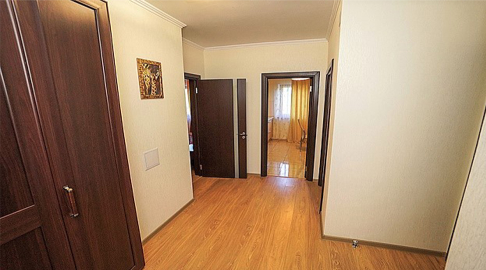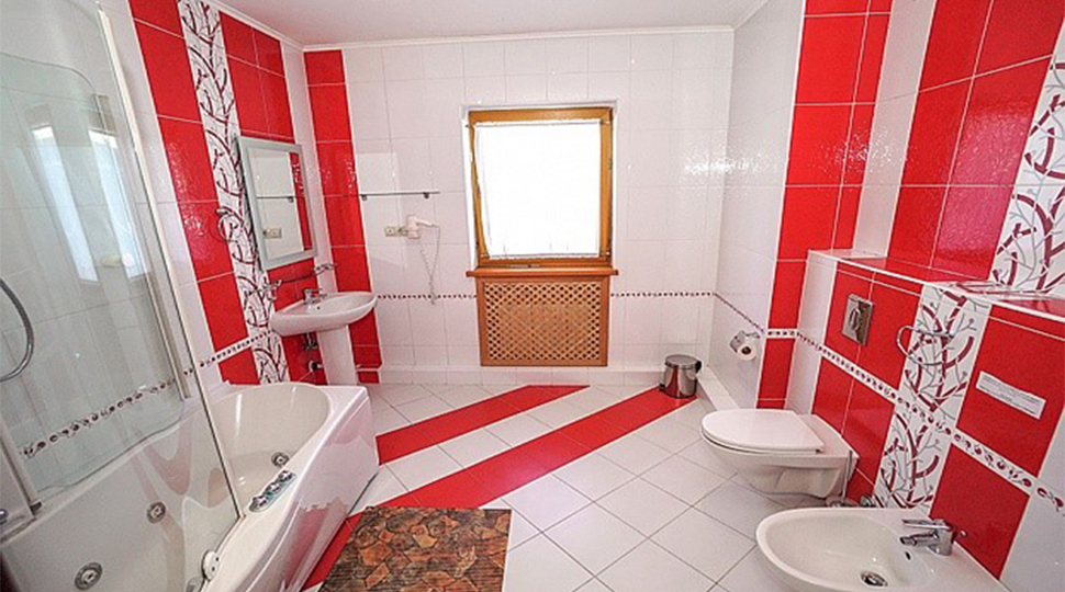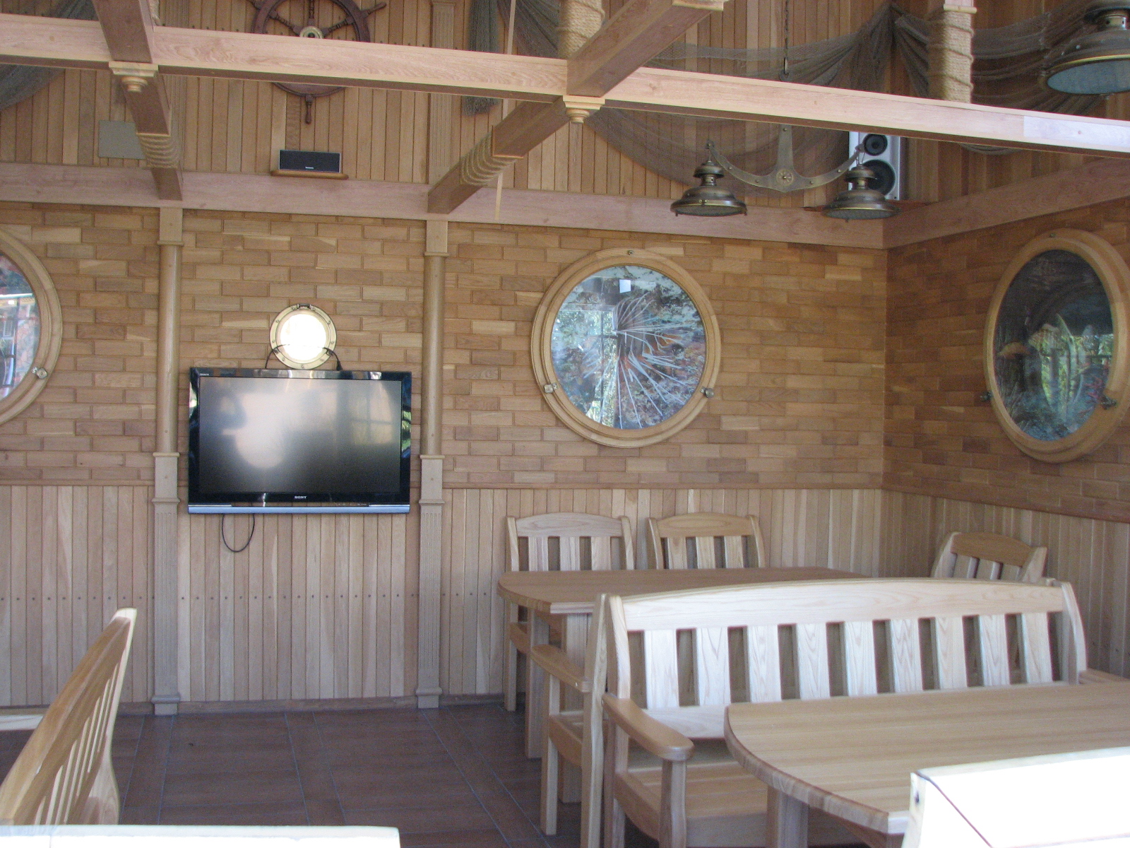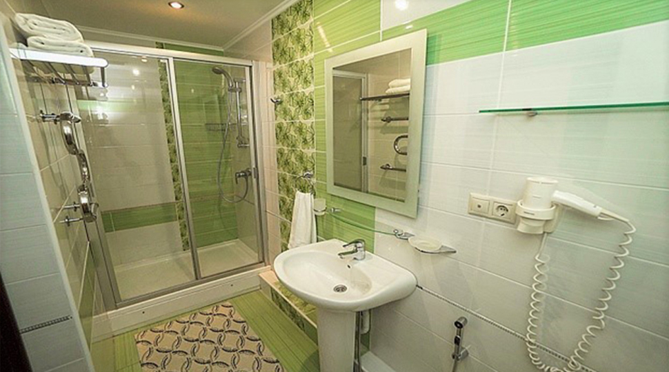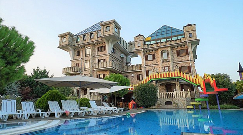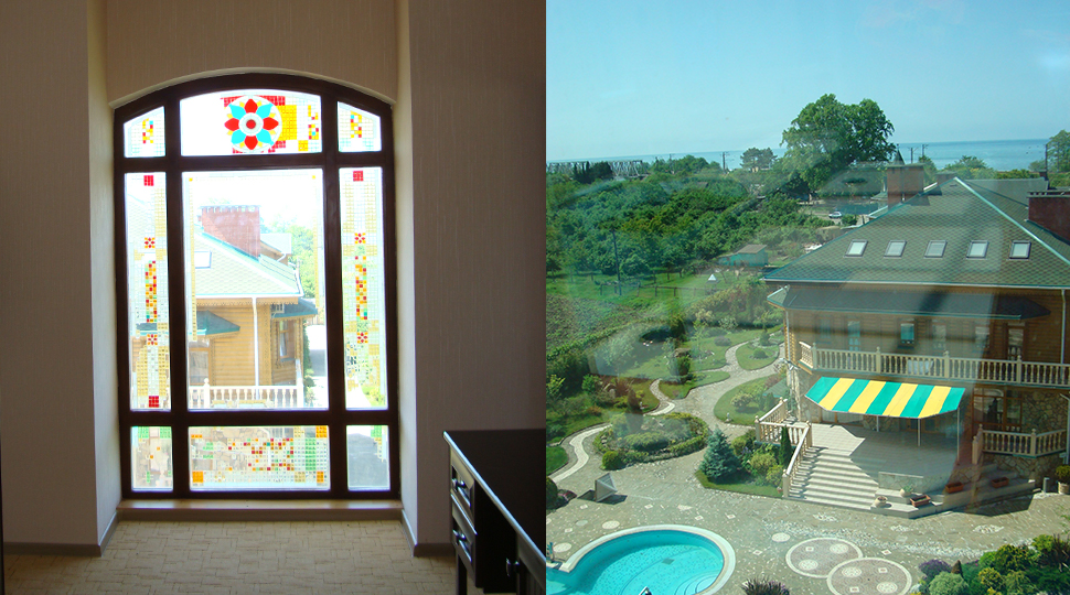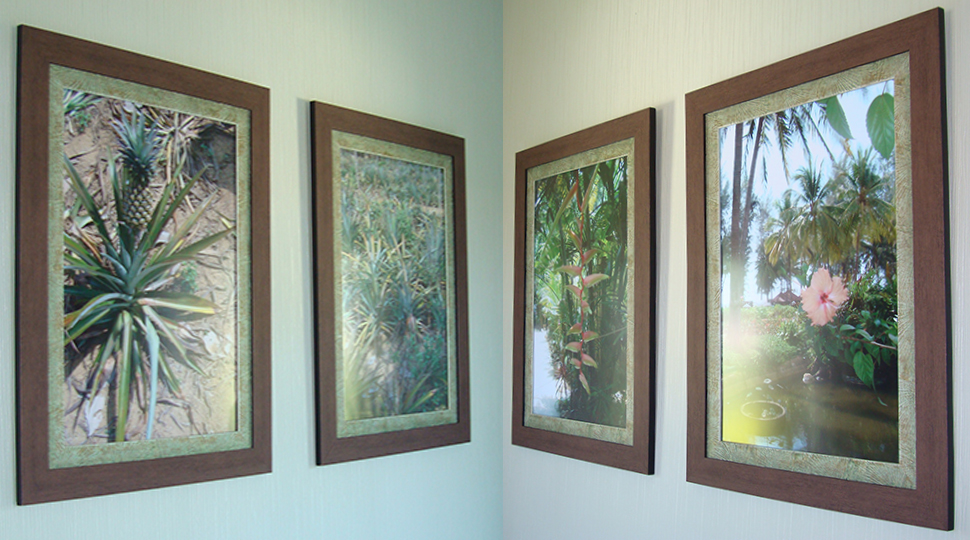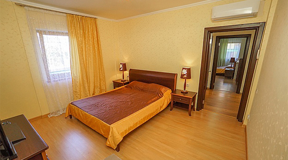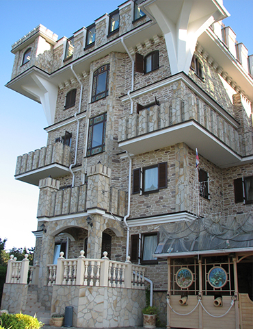 Основной современный оттенок мебели "венге" на контрасте оживляли яркими акцентами: красивыми абажурами люстр с фиолетовыми стеклянными подвесами и фиолетовыми нитями, уютными торшерами с прорезями в форме растительных узоров. В номерах создали настроение фото постеры с видами замка и экзотическими животными и цветами. По колористике номера разделены на два типа: лаймовый и абрикосовый. Бар гостиницы "Замок стилизован под подводную трюм подводной лодки, в иллюминаторах которого видны глубины и обитатели океана. Кругосветное путешествие на собственной подводной лодке- мечта хозяина "Замка". Исходя из этих двух основных цветов моделировались покрывала на кровати: центральные части ошивались в оттенках лайм и золотистый абрикос, а фестоны по периметру покрывал— в более темный цвет под мебель. Каждый номер был декорирован своей тематикой фото-постеров с цветными паспорту в тон стен и багетами в тон мебели или текстилю. В результате хозяин получил модернизированные, яркие и современные номера согласно установленному бюджету.