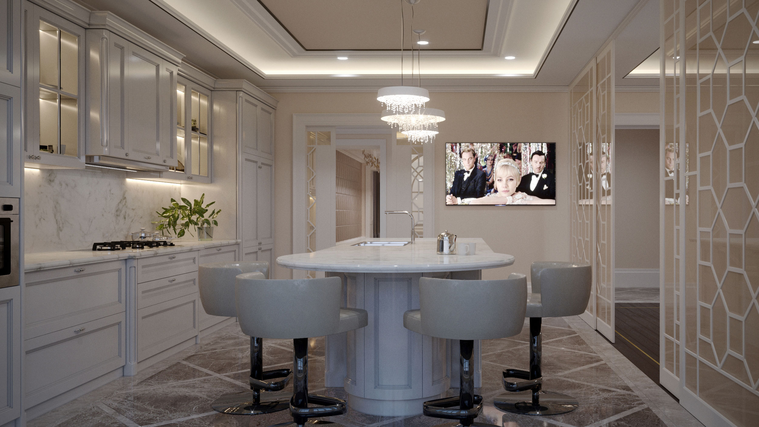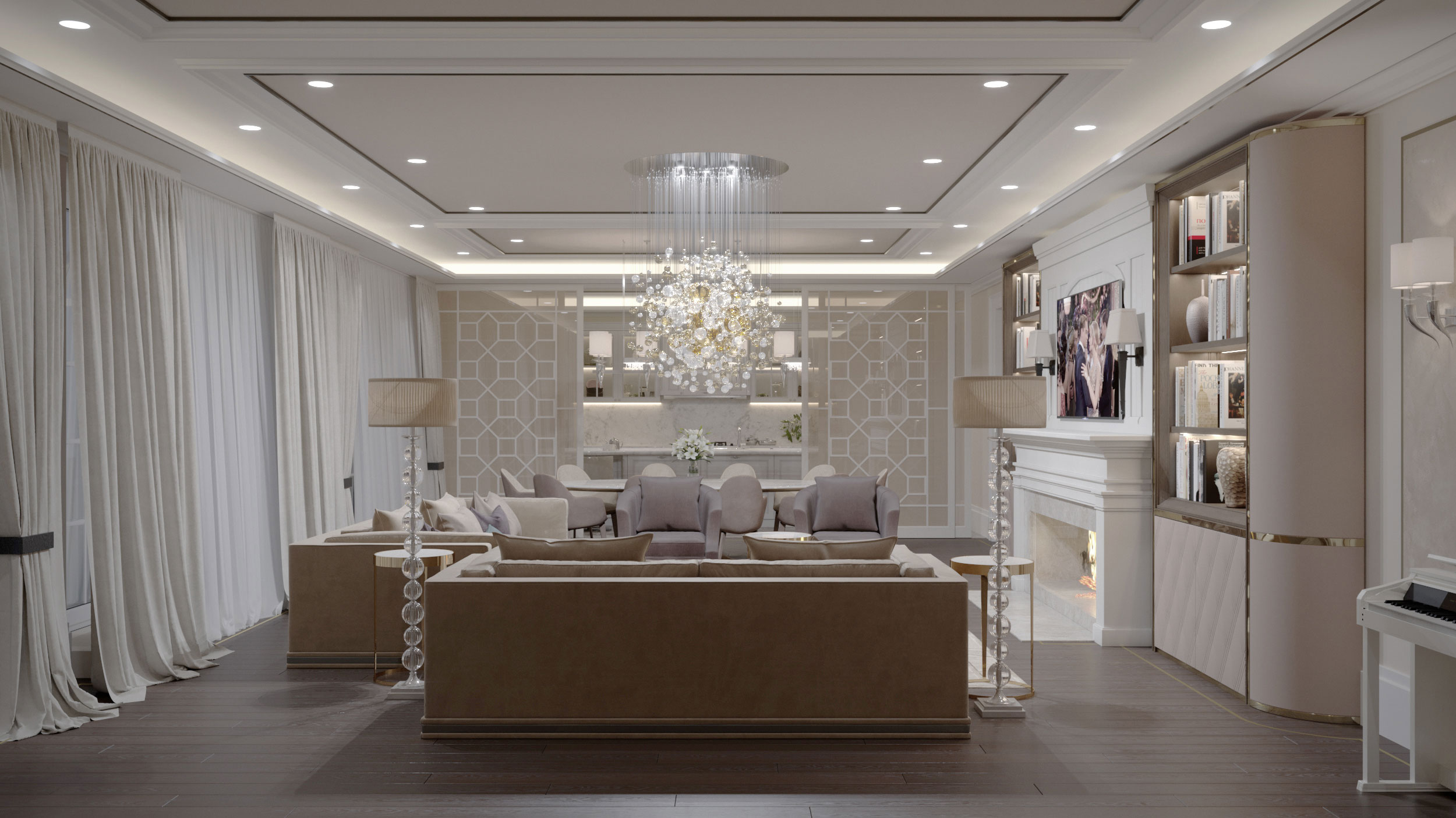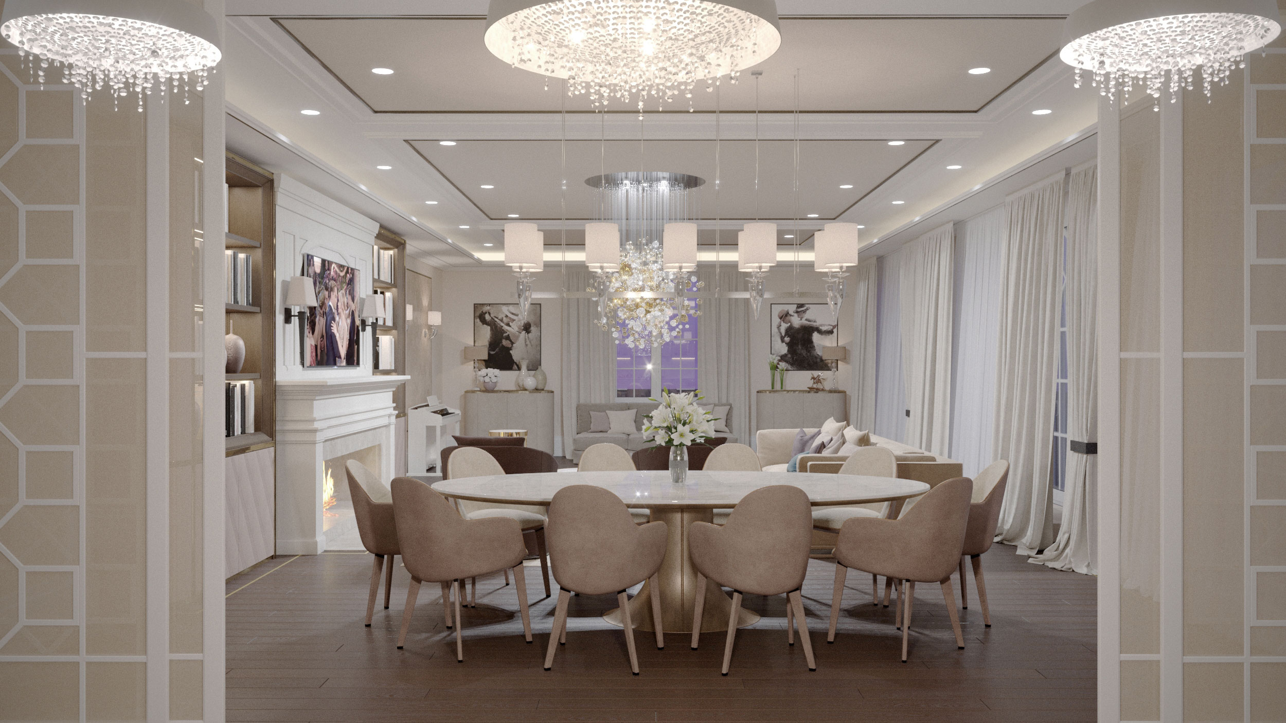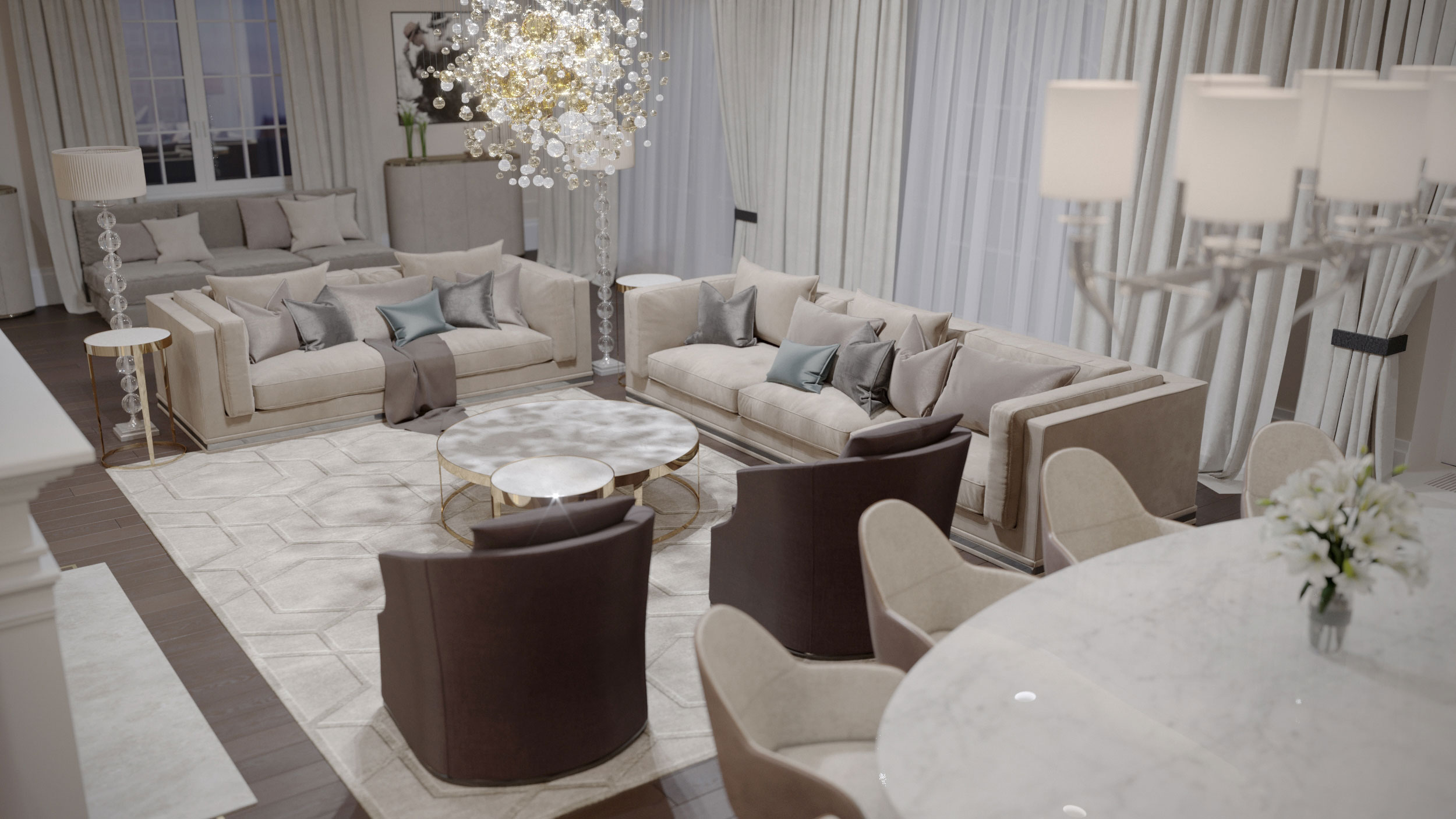 Перед дизайнером стояла задача: в кратчайшие сроки переделать проект, ранее созданный другой командой, улучшить планировку, изменить стилистическое решение и вписать ряд предметов, по вкусу заказчика. Необходимо было создать уютный, респектабельный интерьер с акцентными элементами, как, напрмер, любимые люстры семьи.