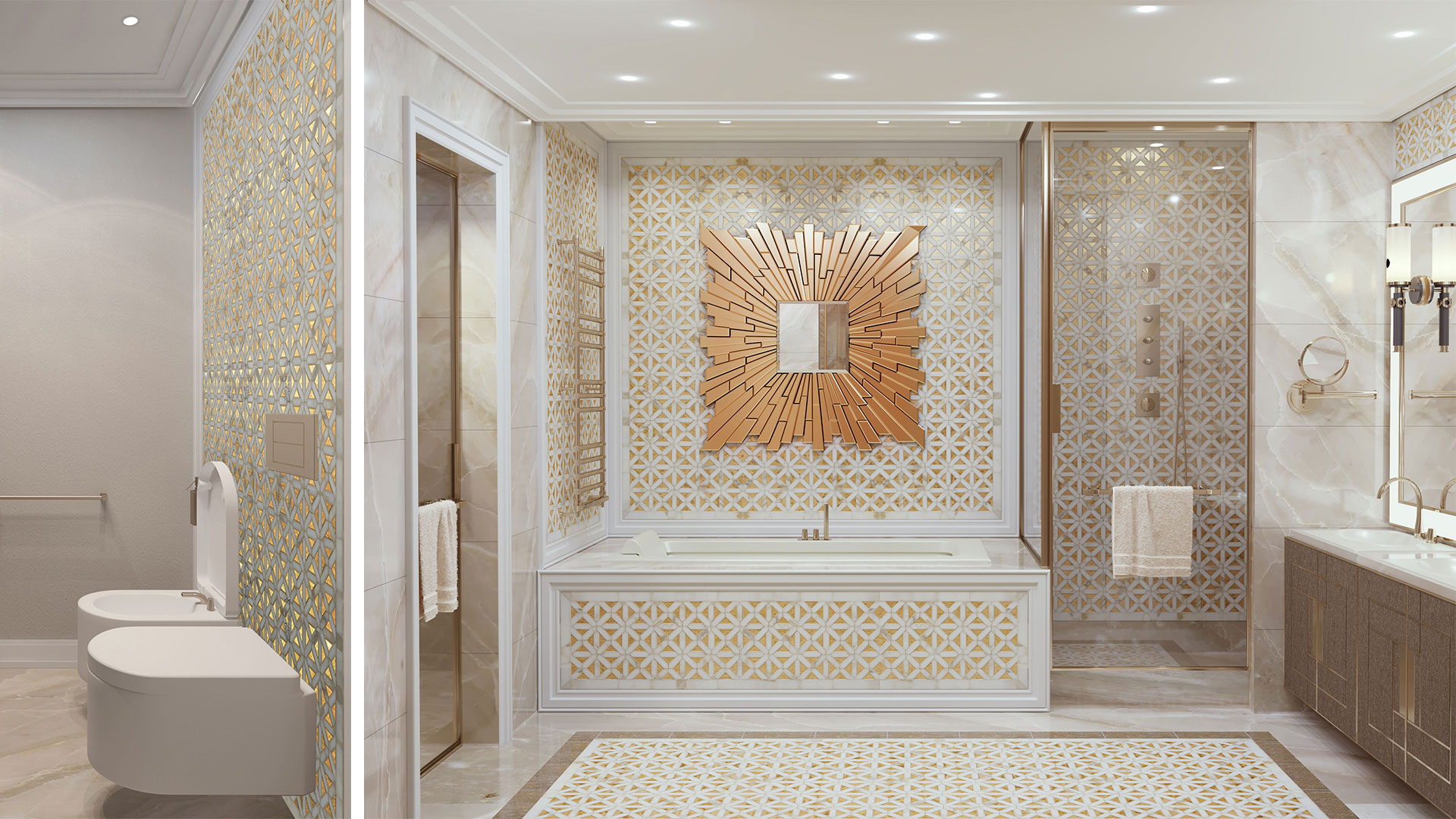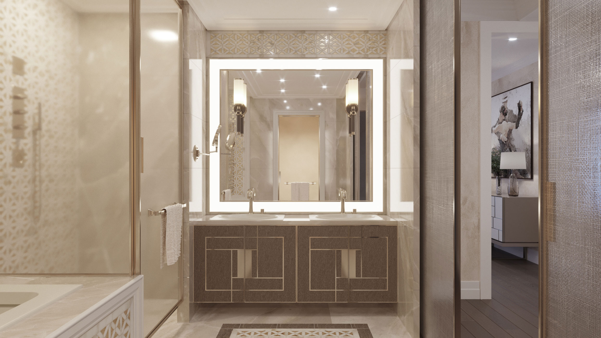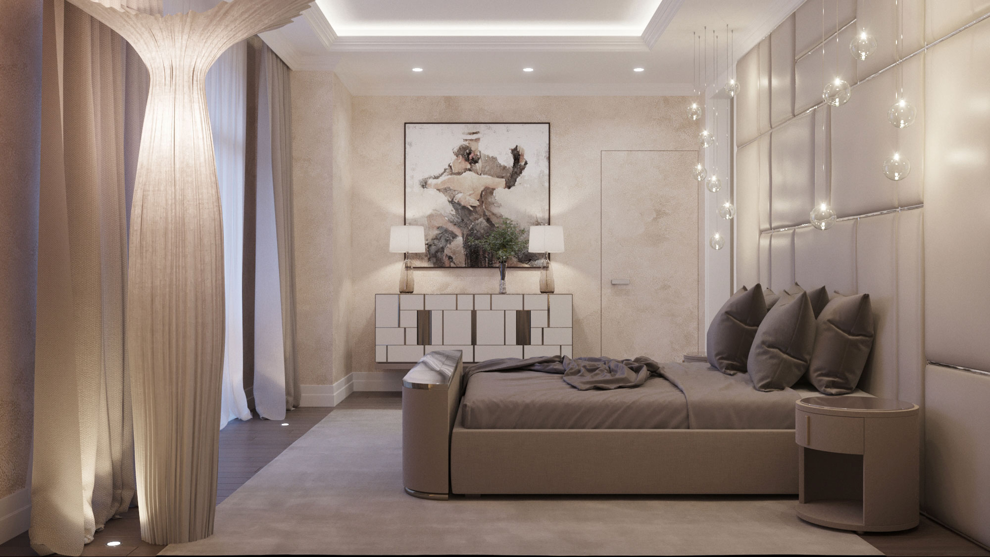 Основной лейтмотив данного интерьера – гармоничное сочетание натуральных материалов по цветовому решению и по фактурам: камень, дерево, кожу, металл. Планировочное решение предусматривает деление квартиры на три основные зоны: детская - две спальные с отдельными санузлами, гардеробными и игровой комнатой; родительская - спальная, гардеробная и санузел; общая - холл; гостиная, столовая и кухня с выходом на террасу, откуда открываются панорамные виды на Москву. Проект предполагает большое количество предметов индивидуального изготовления по эскизам автора.
