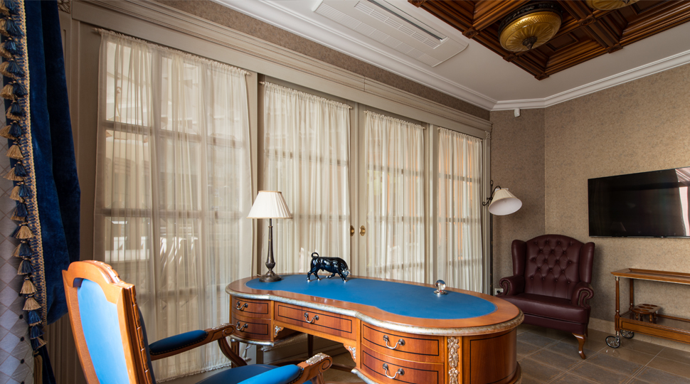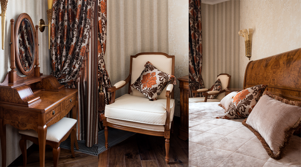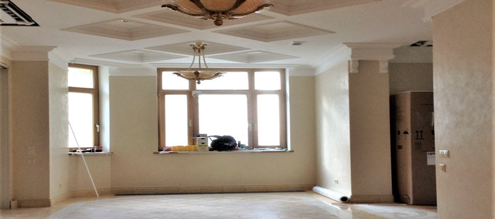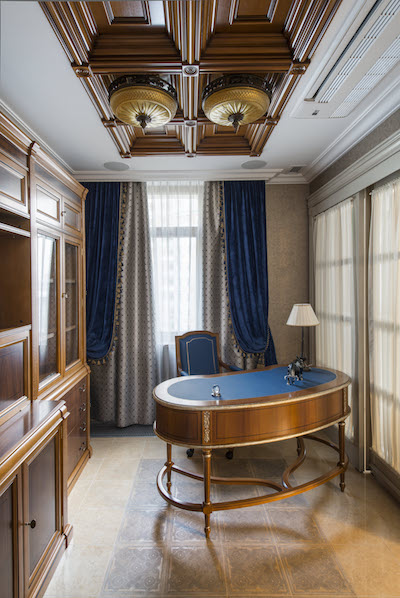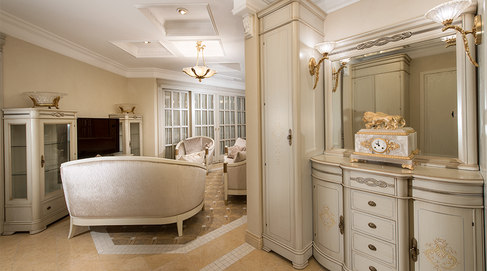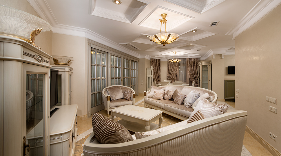 Гармония чистых форм и линий, классические пропорции, благородные светлые оттенки с тактичным включением цветовых акцентов. Главной темой проекта стала эстетика палаццо эпохи Ренессанса с безупречными сочетаниями элементов архитектурой композиции. Кесcонированные потолки, карнизы, фризы, лепнина, элегантные люстры от MARINER- все эти детали создали образ элегантного, респектабельного интерьера. Вензеля на поверхности фасадов мебели повторяют рисунок на дверях по индивидуальному эскизу. Большое внимание в проекте уделено дизайну напольных покрытий. Декоративные панно из итальянского мрамора c уникальными рисунками. Эти великолепные мраморные «ковры» подчеркнули деление квартиры на функциональные зоны.