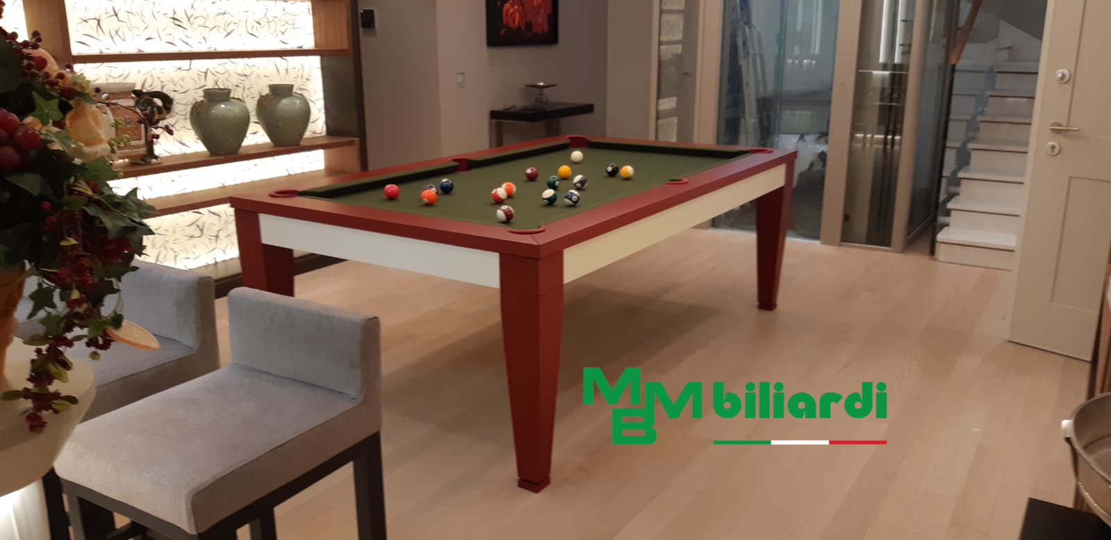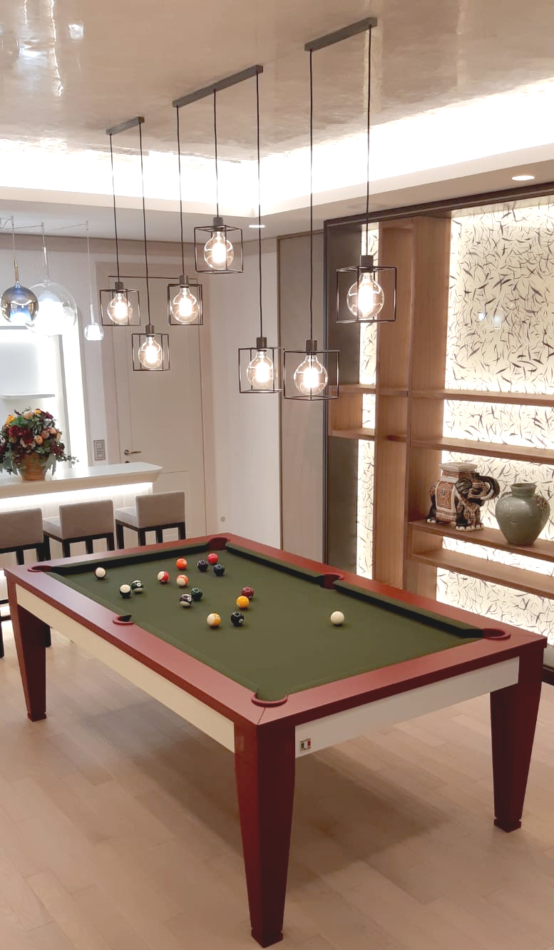 Архитектор проекта обратился к официальному дистрибьютору фабрики MBMbiliardi в России- компании Elpaso. Бильярд поставлялся сразу от фабрики во Францию, маршрутом Рим - Булье. С представителями заказчицы в Москве выбрали модель, материалы, тип игры и оттенок сукна. Гостей в Новый год 2019 хозяйка дома встречала с новым современным и элегантным бильярдом. Сотрудничество нашей компании и автора проекта дома продолжается.