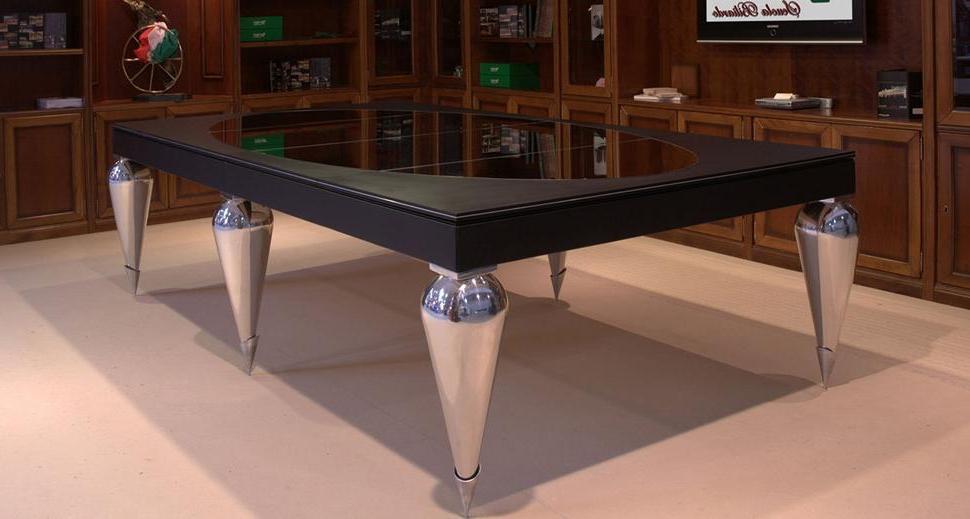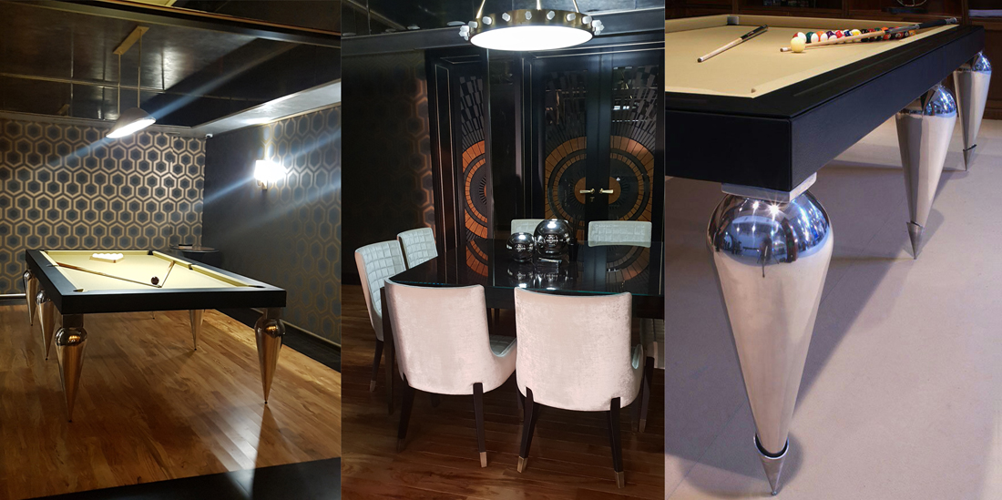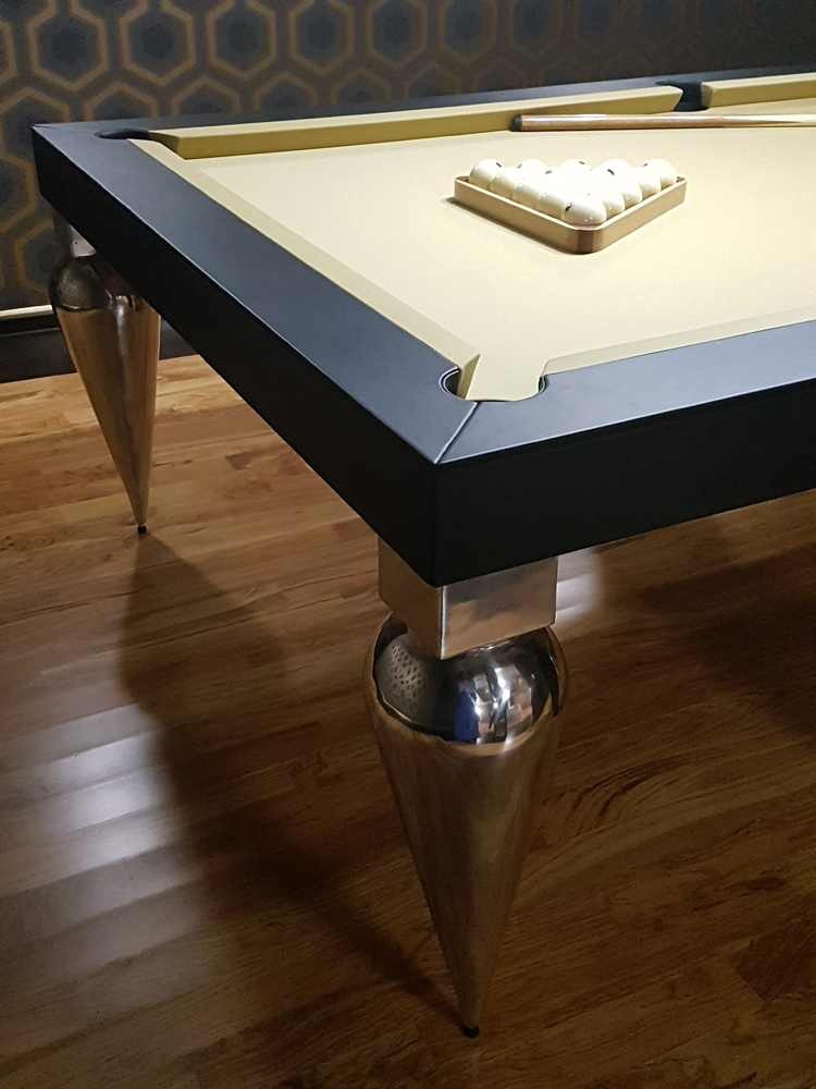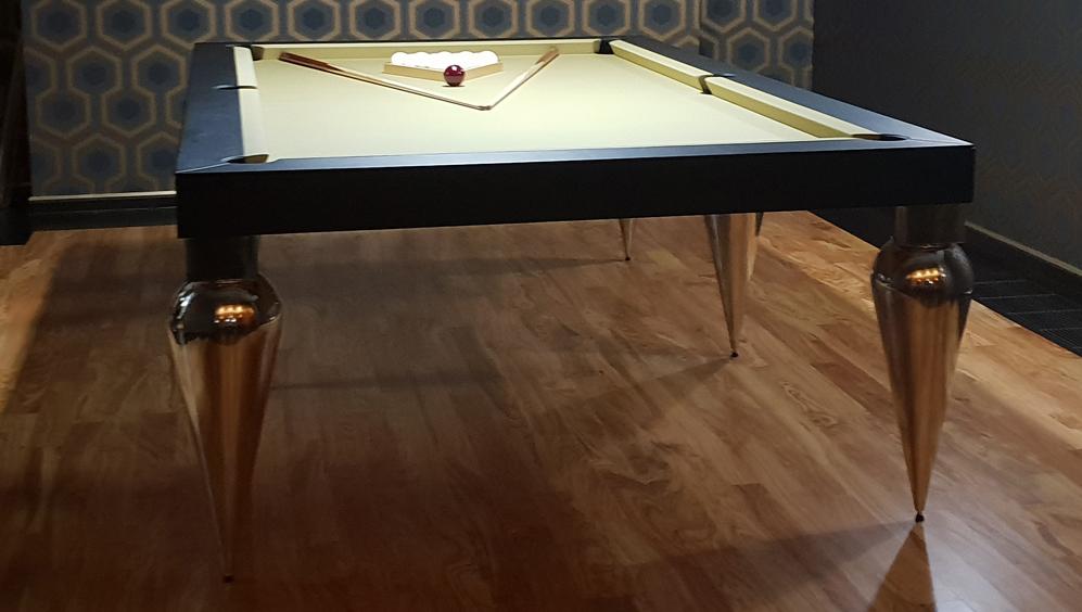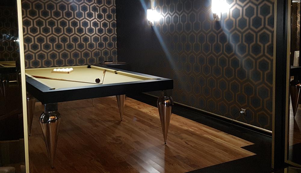 Подобрать для зоны отдыха загородного дома дизайнерский бильярдный стол в общей концепции дизайна интерьера от талантливого архитектора. Бильярд расположить рядом с барной комнатой в стилистике арт-деко. Особенное пожелание к модели бильярдного стола: элегантные ножки из стали в форме капель.