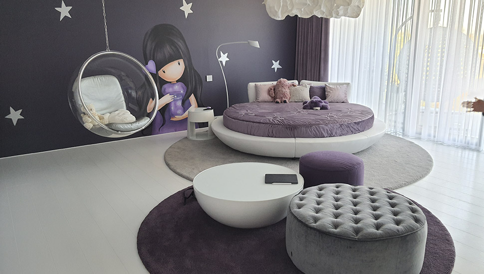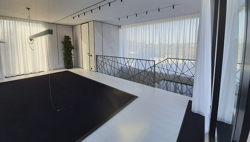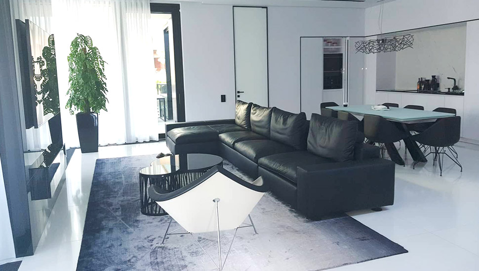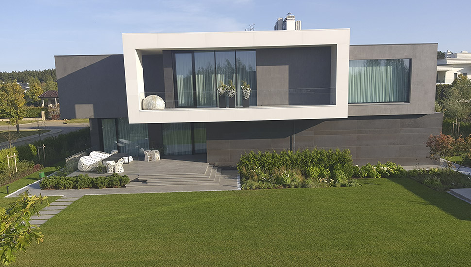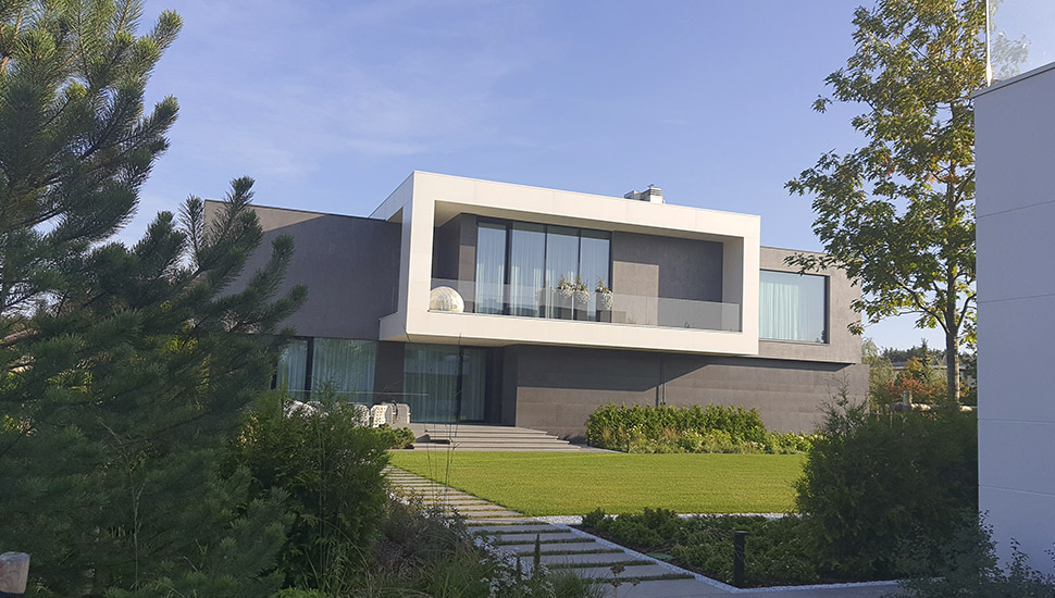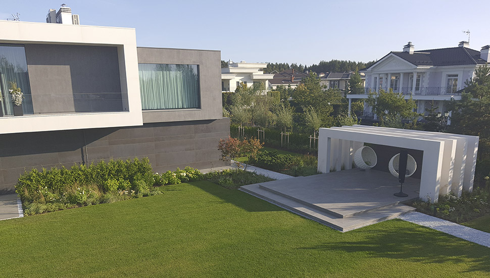 Нео-футуризм и геометрика, минимум цветов в двух домах: хозяйском и гостевом. В преимуществе оттенки чёрного,белого и серый-графит.