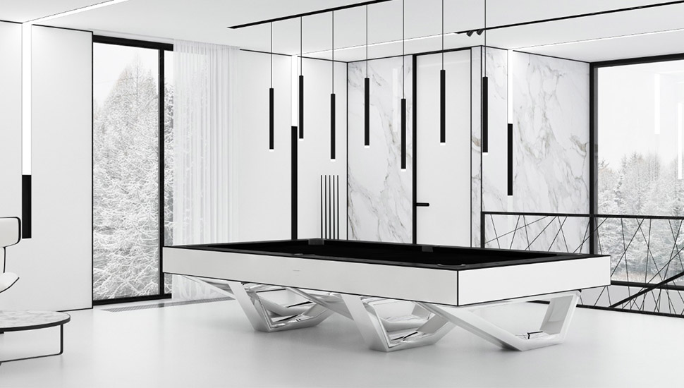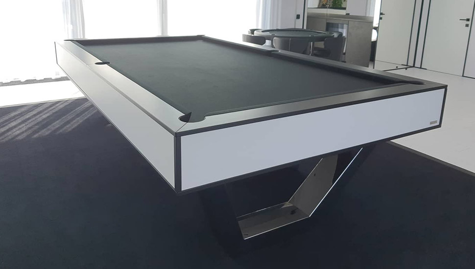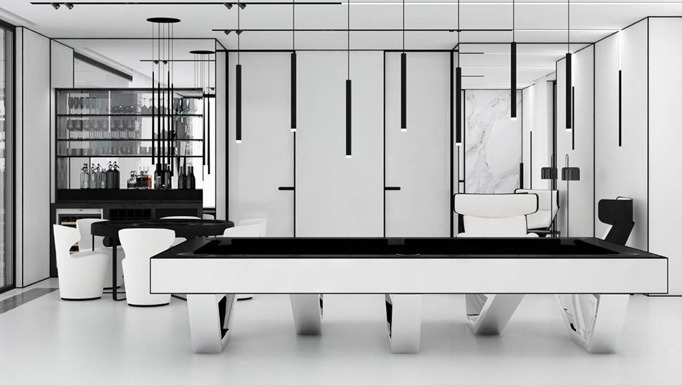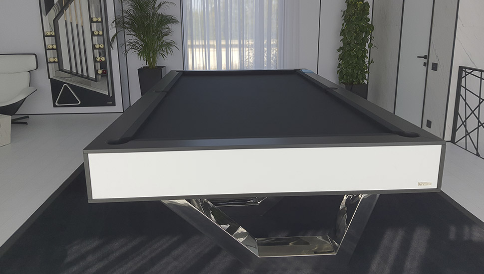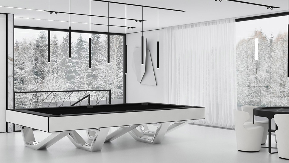 для гостевого дома на террасной крыше реализовать дизайн бильярдной по эскизным моделям архитектурного бюро "Geometrix" в стиле нео-футуризм. Требования заказчиков были высоки к каждой детали бильярда, киевницы и крикера. Основания бильярда согласовывались по образцам из Италии от фабрики MBMbiliardi. Выбрана зеркальная сталь в обработке по технологии "гальваника".